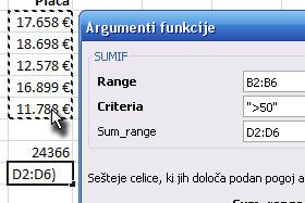 V polje Criteria vpišite >50 in polju Sum_range določite celice s plačami (glej sliko).