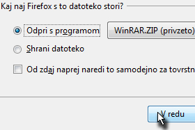 Brskalnik nas vpraša, kaj naj stori z datoteko. Datoteka je v formatu ZIP. Odprete jo lahko z WinZip, WinRar ...