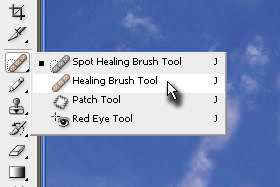 Držite z miško na orodju Spot Healing Brush Tool (bližnjica je tipka J) toliko časa, dokler se ne prikažejo ostala orodja. |