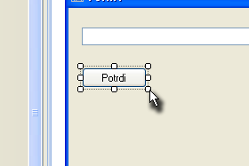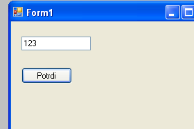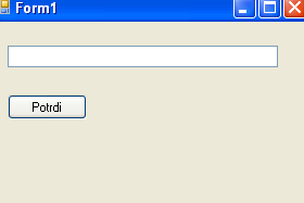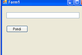 Komponento TextBox vstavite v vaš program, za njo pa na program vstavite komponento Button (gumb), ki mu po potrebi v oknu Properties dodate napis Potrdi, kot sem to storil jaz (glej sliko).