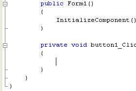 Z dvoklikom na gumb preidemo v obrazec za pisanje kode. Spodnja koda prikazuje trenutno kodo, ki je že samodejno vpisana. Vso kodo bomo kasneje pisali v preoceduro button1_Click (glej kodo).