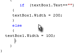 if (pogoj) { ko je pogoj TRUE } else { ko je pogoj FALSE } Mi bomo napisali: if (textBox1.Text=="") { textBox1.Width = 200 } else { textBox1.Width = 100 } Kaj smo sploh s tem sedaj napisali? Width - širina se uporablja za določanje širine. Če bo vnosno polje prazno, bo širina le-tega 200 px, sicer bo širina 100 px. Zelo pomembna stvar je, da pri pogoju (textBox1.Text == "") uporabite dvojni enačaj. C# ima malce drugačno kodo kot VB in za je enako uporablja dva enačaja. |