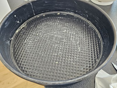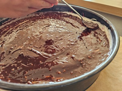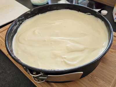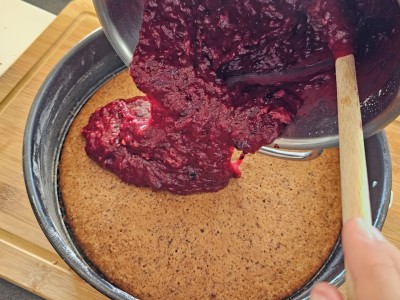 Pripravljeno kremo nanesite na pecivo, ki se nahaja še vedno v pekaču s stranicami, saj boste le tako ohranili izgled. |