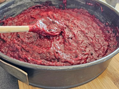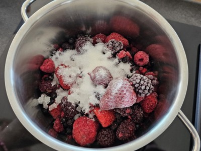 Pripravili bomo kremo za torto. V lonec dodajte 450 gramov zmrznjenih goznih sadežev in 50 gramov sladkorja. Lonec začnite na kuhalni plošči na srednji temperaturi počasi segrevati, da boste dobili nekakšno marmelado. |