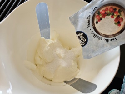 Pripravili bomo jogurtovo kremo. V lonec dodajte 250 gramov grškega jogruta in vrečko vanilijevga sladkorja ter vse premešajte. |