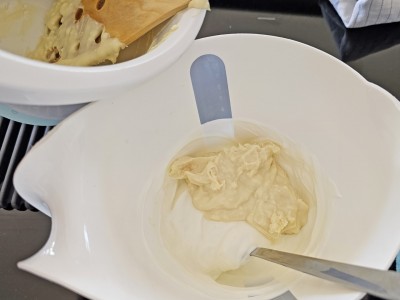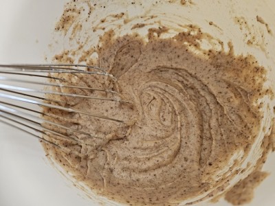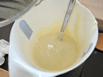Sedaj pa obe posodi družita in dobro premešajte, da dobite lepo maso za biskvit. |