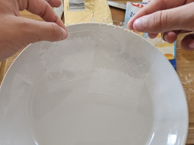 V večji krožnik z vodo dodajte 2 lista želatine za približno 5 ali več minut. |