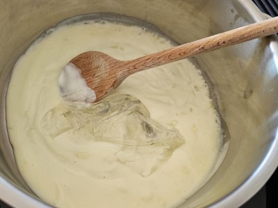 Polovico mase z grškim jogurtom in belo čokolado dodajte v drugi lonec, kjer imate nastavljeno srednjo temperaturo. V ta lonec dodajte ožeti želatini in dobro vse skupaj premešajte, da se masa lepo pripravi. |