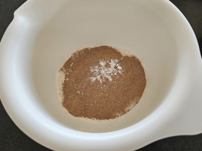 V drugo posodo dodajte 120 gramov moke, 100 gramov sladkorja in 25 gramov kakava v prahu. Dodajte 1 žličko pecilnega praška, 1 vrečko vanilijevega sladkorja, ščepec soli in žličko sode bikarbone. Premešajte vse skupaj. |