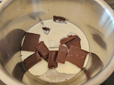 Pripravili bomo čokoladni preliv. V lonec dodajte 125 gramov temne čokolade in 1 dl smetane za stepanje. |