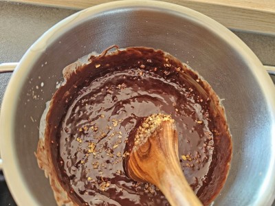 Kuhajte počasi in ko bo krema postala lepa in tekoča, dodajte v maso mlete lešnike. Lahko tudi brez lešnikov, če vam niso všeč ali jih nimate. |