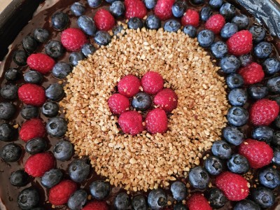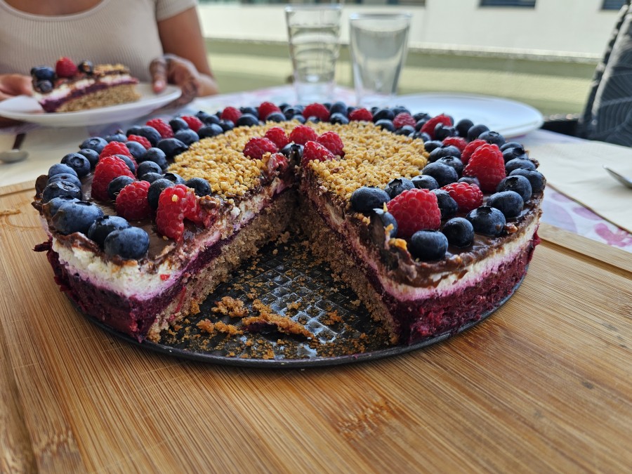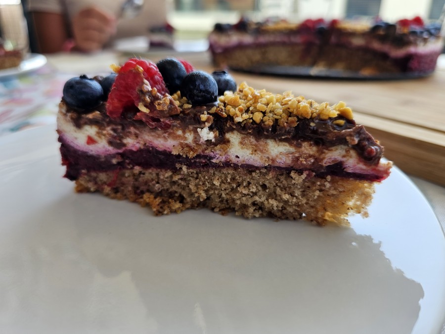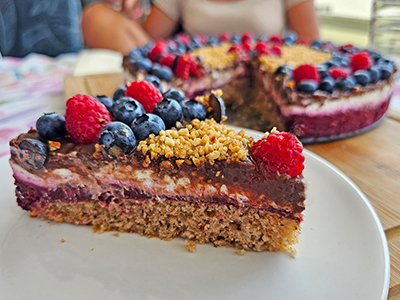 Ko bo kolač ohlajen in strjen, ga okrasite s svežimi malinami in borovnicami ter posujte še z mletimi lešniki. Improvizirajte, sveže sadje oziroma jagodičevje je najbolje. |