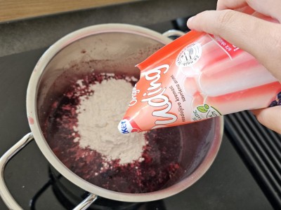 Dodajte v lonec 1 vrečko jagodnega pudinga. |