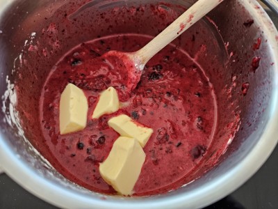 Dodajte še 40 gramov masla in vse dobro premešajte, da se bo med kuhanjem stopilo in naredila lepa krema. |