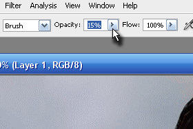 ![]() Pritisnite tipko E, da izberete orodje Eraser Tool in nato zgoraj v orodni vrstici določite Opacity na 15% (glej sliko). |
