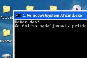 Kako ukazati sistemu, da ob zagonu .bat datoteke v MS-DOS okno vpiše neko besedilo in počaka na pritisk tipke za zaprtje datoteke? Vpišite: @echo off echo Dober dan! pause Podobno, kot pri PHP, se tudi tukaj za ispisovanje uporablja ukaz echo. Ukaz pause pa računalniku ukaže, da pred zaprtjem MS-DOS okna počaka na pritisk tipke. |