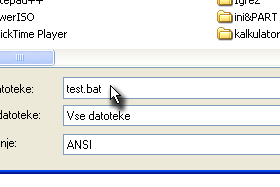 Sedaj v Beležici odprite meni Datoteka -> Shrani kot..., označite Vse datoteke in za ime datoteke vpišite test.bat