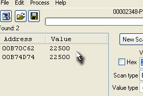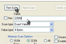 V programu v okence napišemo Vsoto (22500), Scan Type nastavimo na Exact Value, Value Type pa na 4 Bytes.
