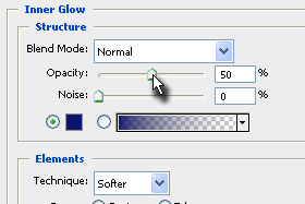Pri Inner Glow nastavite barvo na poljubno temno modro, Opacity pa na 50 %.