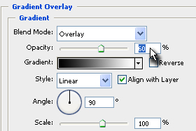 Pri Gradient Overlay pustite preliv na privzeti barvi, Blend mode nastavite na Overlay in Opacity nastavite nekje na 60 %.
