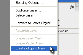 V oknu za layerje ponovno klinite z desnim miškinim gumbom in izberite Create Clipping Mask.