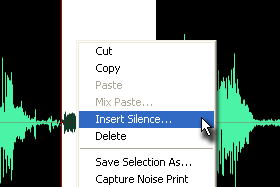 Na selekcijo kliknemo z desnim miškinim gumbom in kliknemo na Insert silence. |