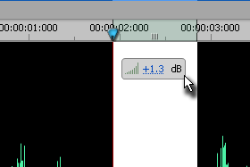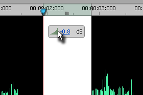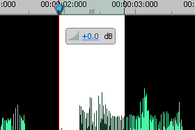 Za začetek bomo malce znižali glasnost. Z miško pojdite do oznake za višanje/nižanje glasnosti na vrhu selekcije. Sicer lahko kar direktno vpišete, npr. -3.2 dB, ali pa preprosto kliknete na znakec za glasnost in se z miško pomaknete v levo stran.