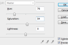 Image->Adjustments->Hue/Saturation... ali preprosto pritisnitemo CTRL+U. Sedaj pa v novem oknu spodaj označite Colorize. Ostalo pa sami malo sprobavajte in premikajte in nato potrdite na gumb OK. Jaz sem označil Hue: (-)76, Saturation: (-)54,lightness: 0. |