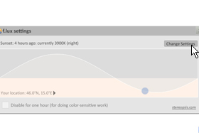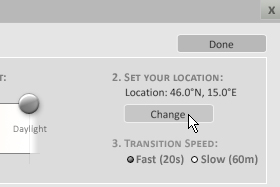 Tako, vaša pozicija je nastavljena. Program bo sedaj točno vedel, kdaj se v vašem kraju stemni. Poglejmo si še nastavitve. Pod prvo točko imamo dva drsnika. Z zgornjim nastavljamo toploto barv čez dan, s spodnjim za čez noč.