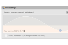 Pri meni trenutno ura ravno kaže polnoč. Če kliknete kamorkoli okoli te krivulje, se bo začel hiter, štiriindvajseturni predogled. Če spodaj kliknete na Disable for one hour, se vam bo f.lux onemogočil za eno uro. |