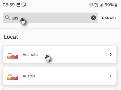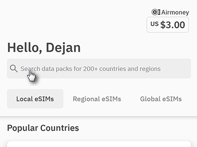 ![]() Namestite si aplikacijo Airalo. Obstajajo tudi druge aplikacije, vendar je ta trenutno najbolj priljubljena. Potem pa v alikaciji kliknite v iskalnik in poiščite državo, v katero potujete. |