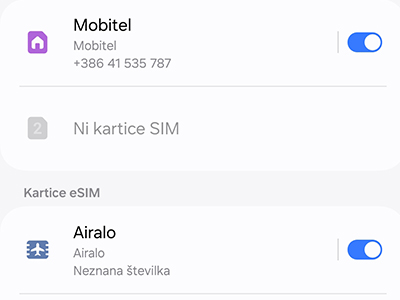 ![]() Sedaj imate aktivirane dve SIM kartici. eSIM podpirajo skoraj vsi novi telefoni, izdani po letu 2020. Z operaterjem se lahko zmenite tudi, da vam ne more v tujini zaračunati več kot 1 evro na primer. Za Mobitel omrežje sem poslal Limit 1 na 1918, če se ne motim. |