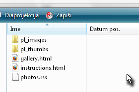 Odpre se vam mapa z elementi, prikazanih na sliki. Za ogled galerije kliknite na gallery.html. Z nekaj znanjem html jezika pa lahko tudi spremenite izgled galerije (dodajanje naslova, barva ozadja, ipd). Galerijo lahko integrirate v neko drugo spletno stran, za to so navodila v dokumentu instructions.html. |