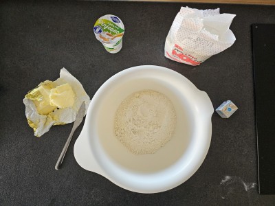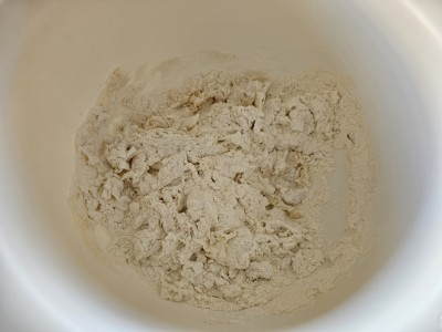 Pripravili bomo maso za šest bombetk. V večjo posodo vnesite 400 gramov moke tipa 400 in dolijte malo mlačne vode.
