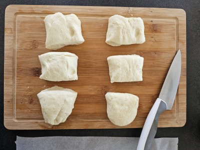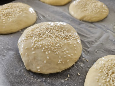 Potem pa vsak del testa oblikujte v bodočo bombetko in jo nato z preostalim beljakom namažite po vrhu ter dodajte sezam. |