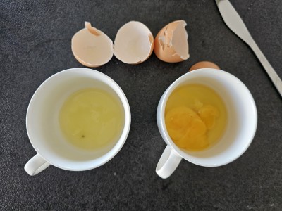 V en lonček dodajte celo jajce in nato še polovico rumenjaka. V drug lonček pa preostali rumenjak. |