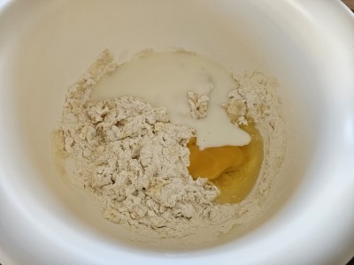 Dodajte v posodo z moko 1 deciliter pinjeneca ter vlijte tisti lonček z dvemi rumenjaki in enim beljakom. |