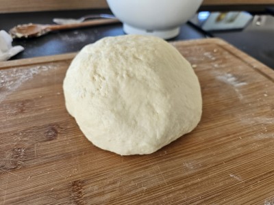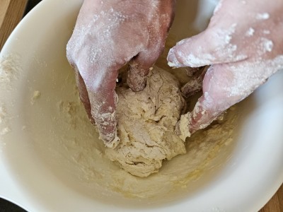 Gneite sedaj testo okoli 10 ali še več minut, da bo postalo lepo in nelepljivo. Če boste potrebovali, dodajte malo mlačne vode ali moko, da boste dosegli pravi rezultat, kot sem ga jaz na sliki. |