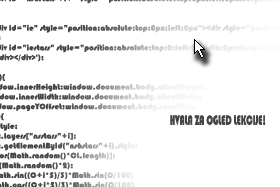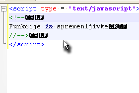<html> <head> <title>Moj javascript dokument</title> Zdaj v značko head zapišimo javascript funkcijo: <script type = "text/javascript"> <!-- Funkcije in spremenljivke //--> </script> Znaka <!-- in //--> uporabite samo takrat, kadar ne želite, da v brskalnikih, ki ne podpirajo javascript, ne pokaže izvorne javascript kode, načelno pa nista obvezna. No, nadaljujmo naprej. Pred tem je pa dobro, da vam povem še, da javascript nič ne "zaostaja" za drugimi jeziki :) Tudi tukaj se, podobno kot pri ostalih programskih jezikih, uporablja za vsako funkcijo podpičje (;). |