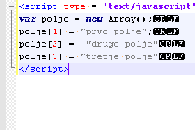 Torej, kode vam ne bom kazal, bi pa izpostavil eno stvar, ki je v javascriptu zelo uporabna. Ta je sicer uporabljena pri vseh programskih jezikih, ampak naj še izpostavim, kako je to urejeno v JavaScript-u. To so polja (Arrays). In sicer, kako izdelam eno spremenljivko s poljem. var polje = new Array(); polje[1] = "prvo polje"; polje[2] = "drugo polje"; polje[3] = "tretje polje"; No, s tem smo uspešno izdelali Array. Zadeva se uporablja pri randominiziranju, in je uporabna še v mnogih drugih funkcijah. (Med drugim tudi na zmaga.com forumu :) ). Ampak, kaj bi se ustavljal tu, nadaljujmo. |
