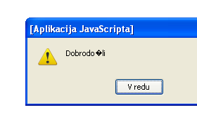 Mi bomo danes obravnavali eno funkcijo, window.alert, ki prikaže sistemsko opozorilo (exclamation). Koda bo takšna: <a href = "javascript: alert('Dobrodošli!')">javascript</a> Ob kliku na povezavo se izvede ta koda, ki prikaže opozorilo Dobrodošli!. Aha, no, tu smo pa že pri novem pisanju javascript kode. javascript: aktivira javascript kodo ob kliku na npr. povezavo. Poskusite napisati v iskalno okno v brskalniku javascript: alert ('zmaga.com') in odziv okna brskalnika bo enak. Prikazalo se bo opozorilo z napisom zmaga.com. |