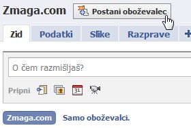 Naša stran je ustvarjena. Sedaj lahko v njo povabite prijatelje. Prvi oboževalec pa boste vi, zato kliknite na Postani oboževalec.