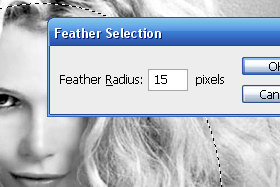 Nato pritisnite tipki CTRL + ALT + D in nastavite Feather Radius na okoli 15 pixels ter kliknite na gumb OK. |