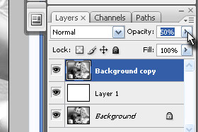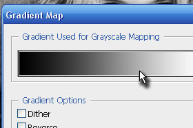 Kliknite zgoraj na Image, Adjustment in izberite Gradient Map... V novem oknu nastavite črnobeli preliv (glej sliko) in kliknite na gumb OK. |