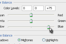 Pritisnite tipki CTRL + B in v novem oknu Color Levels nastavite drsnik proti modri barvi (glej sliko).