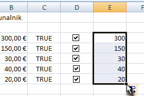 Sedaj bomo na hitro tudi kopirali formulo v celici E3 v vse ostale spodnje celice. Potem pa označite celico E3 in z miško držite za spodnji desni rob celice ... |