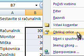 Označite sedaj številke in kliknite na njih z desnim miškinim gumbom ter izberite Oblikuj celice ... |