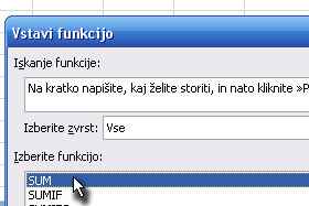 V novem oknu Izberite zvrst označite Vse in nato v polju Izberite funkcijo določite SUM.