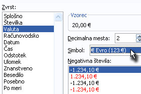 Nato pa pod zvrst določite Valuta in nato Simbol Evro € (glej sliko).