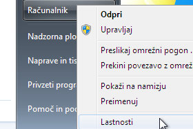 Potem kliknite z desnim miškinim gumbom na Računalnik in izberite Lastnosti.